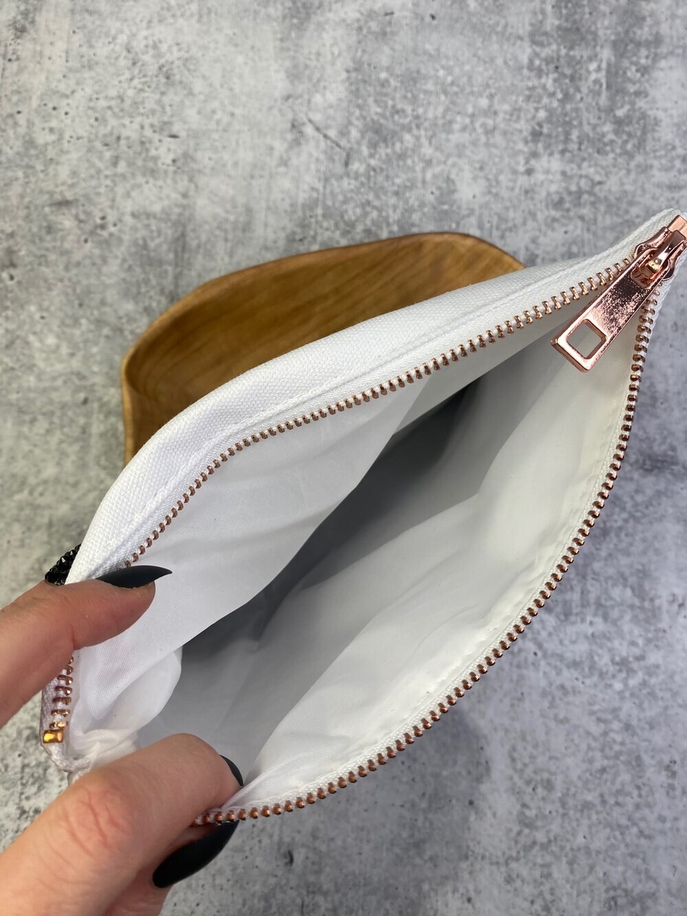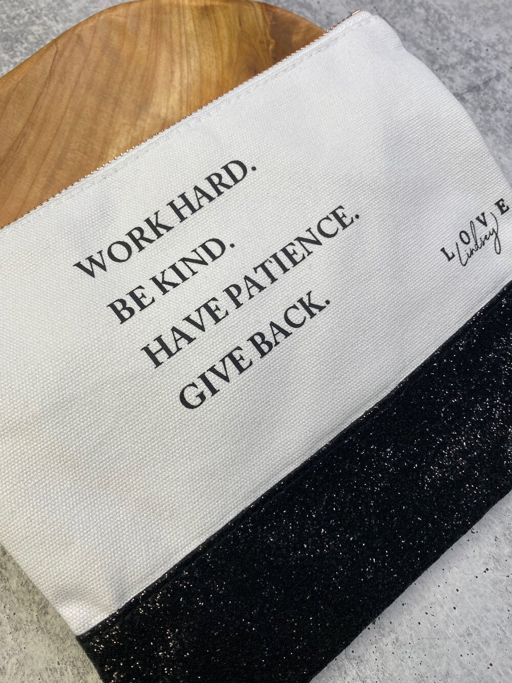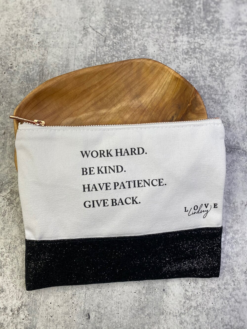 My favorite saying on a canvas pouch with black glitter bottom and rose gold zipper. The inside is lined so it’s easy to wipe out. Use for jewelry, makeup or anything you want to keep safe.