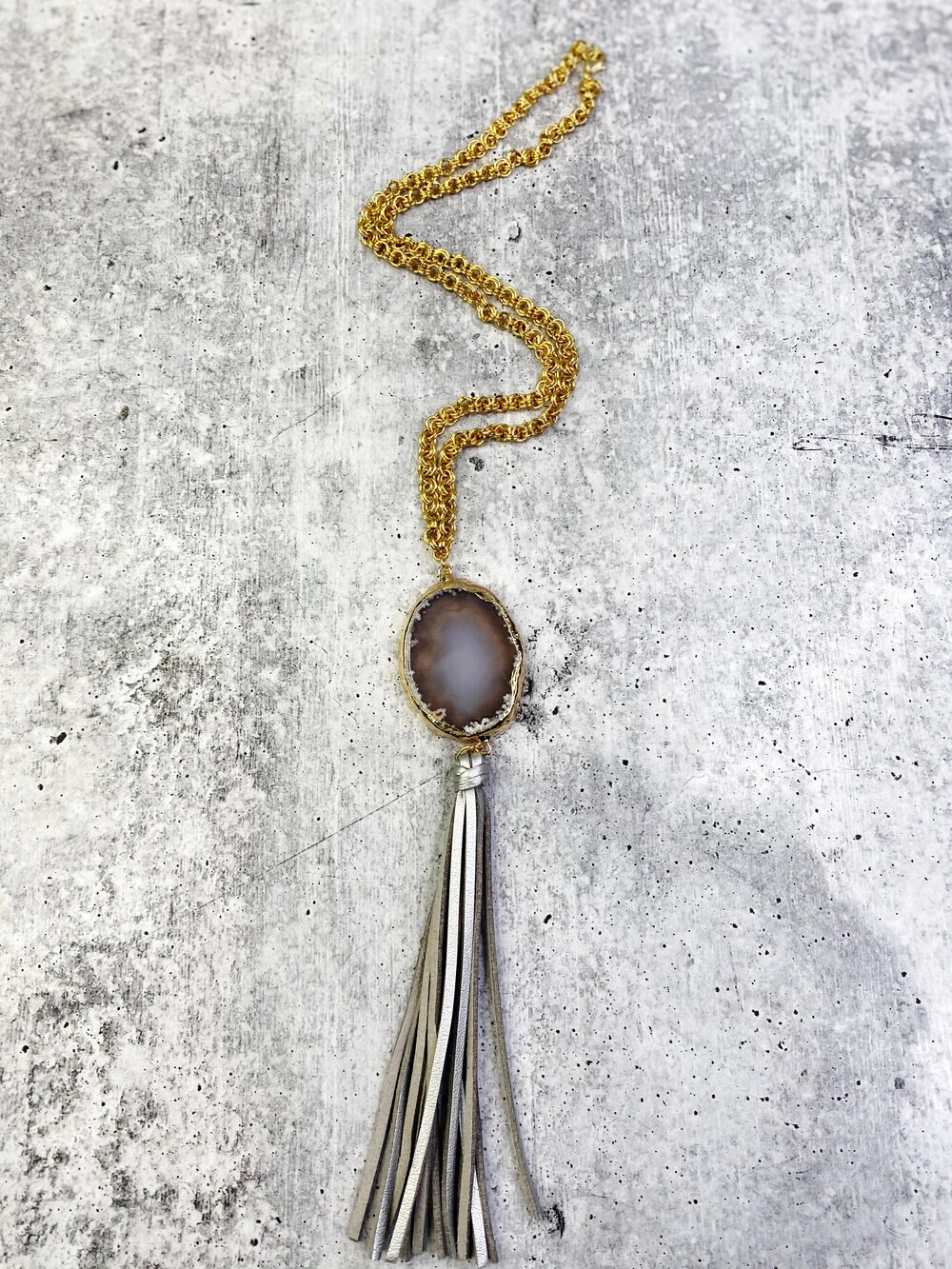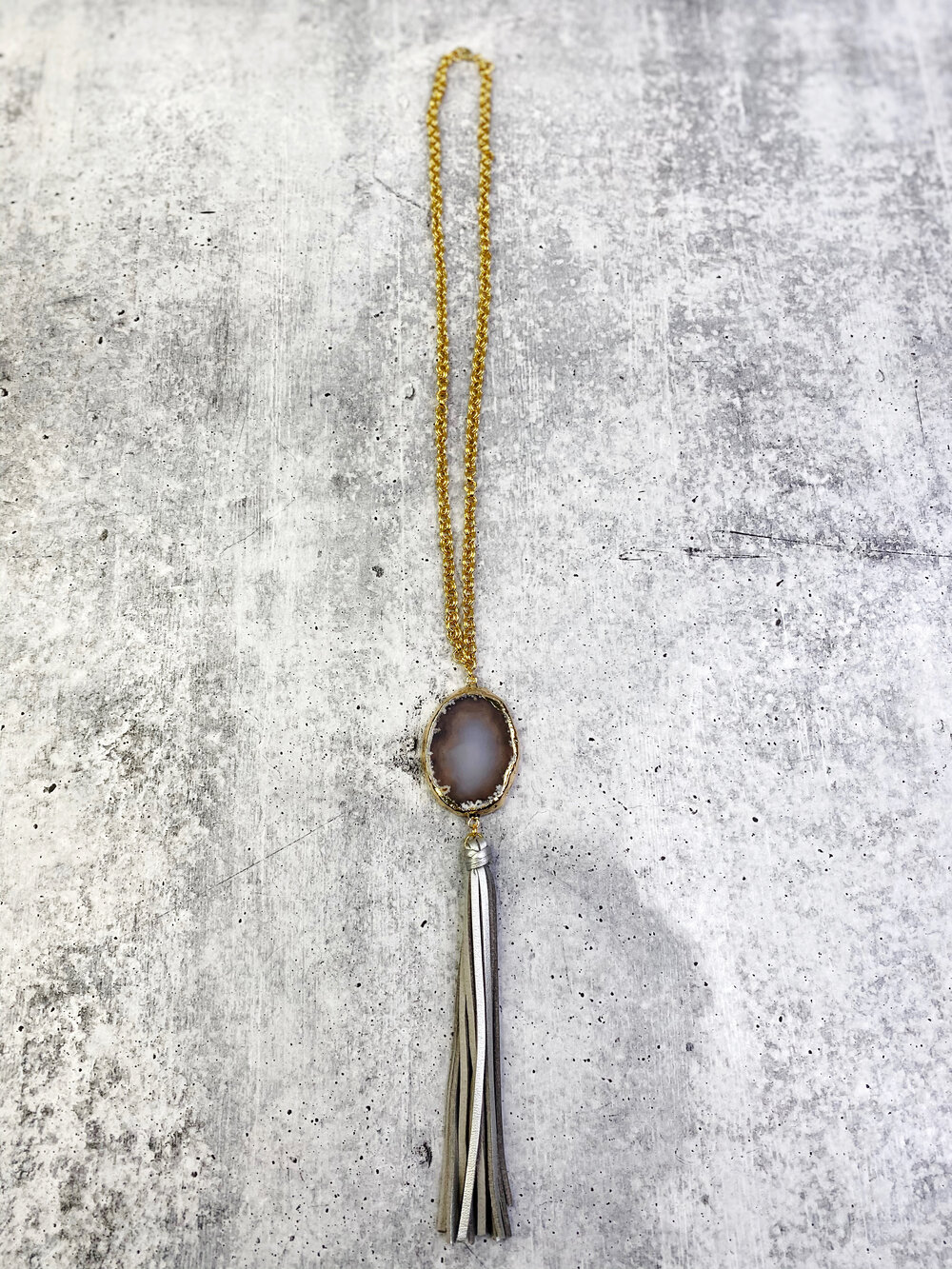 Product Description On a long chain, this stone and tassel necklace is a beautiful, versatile piece to elongate any look.