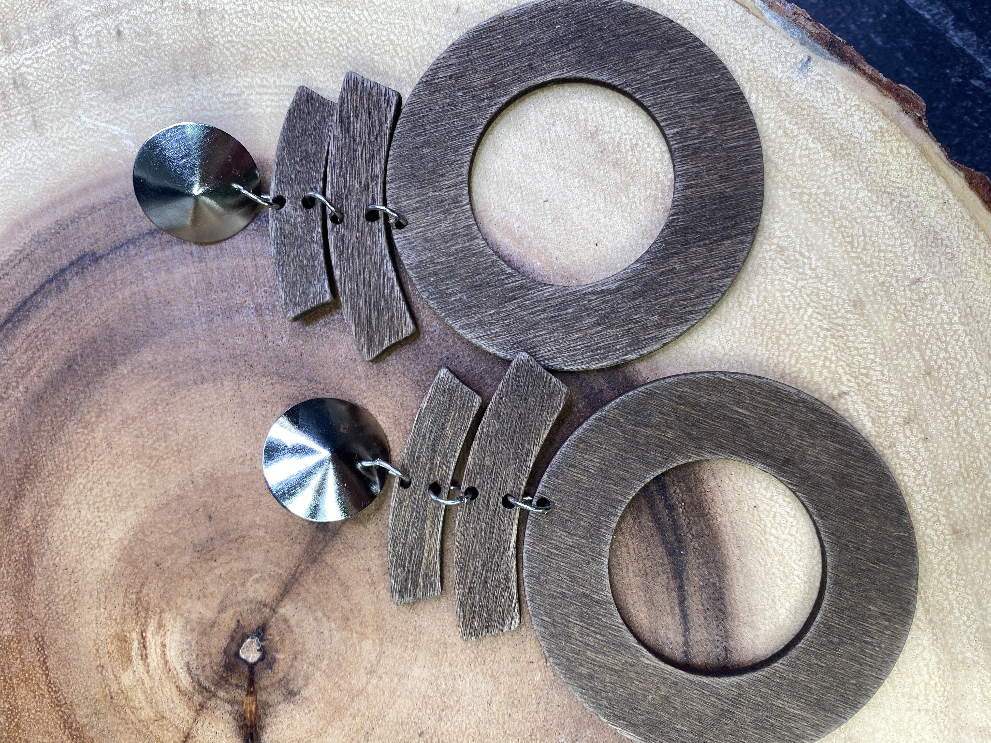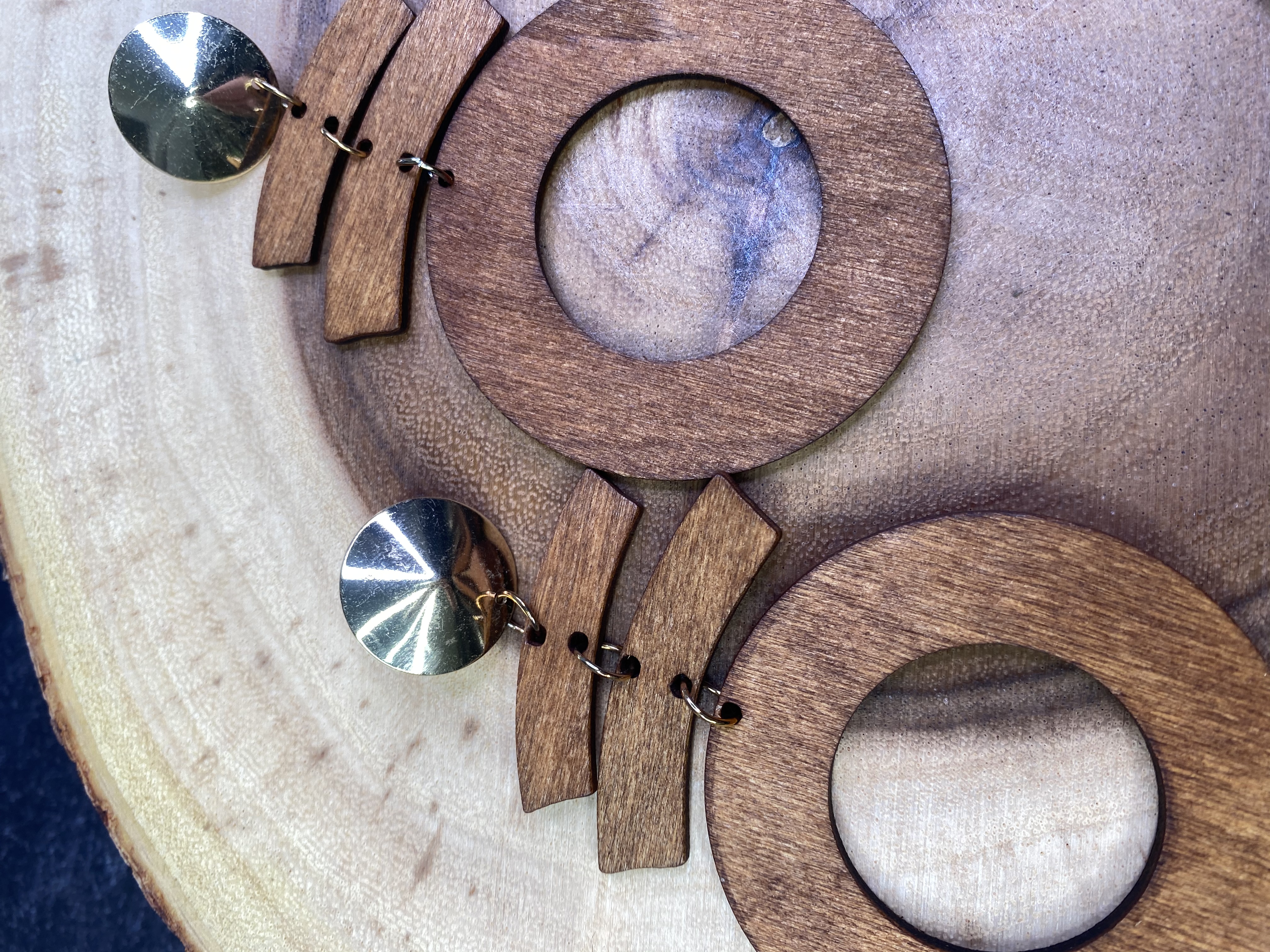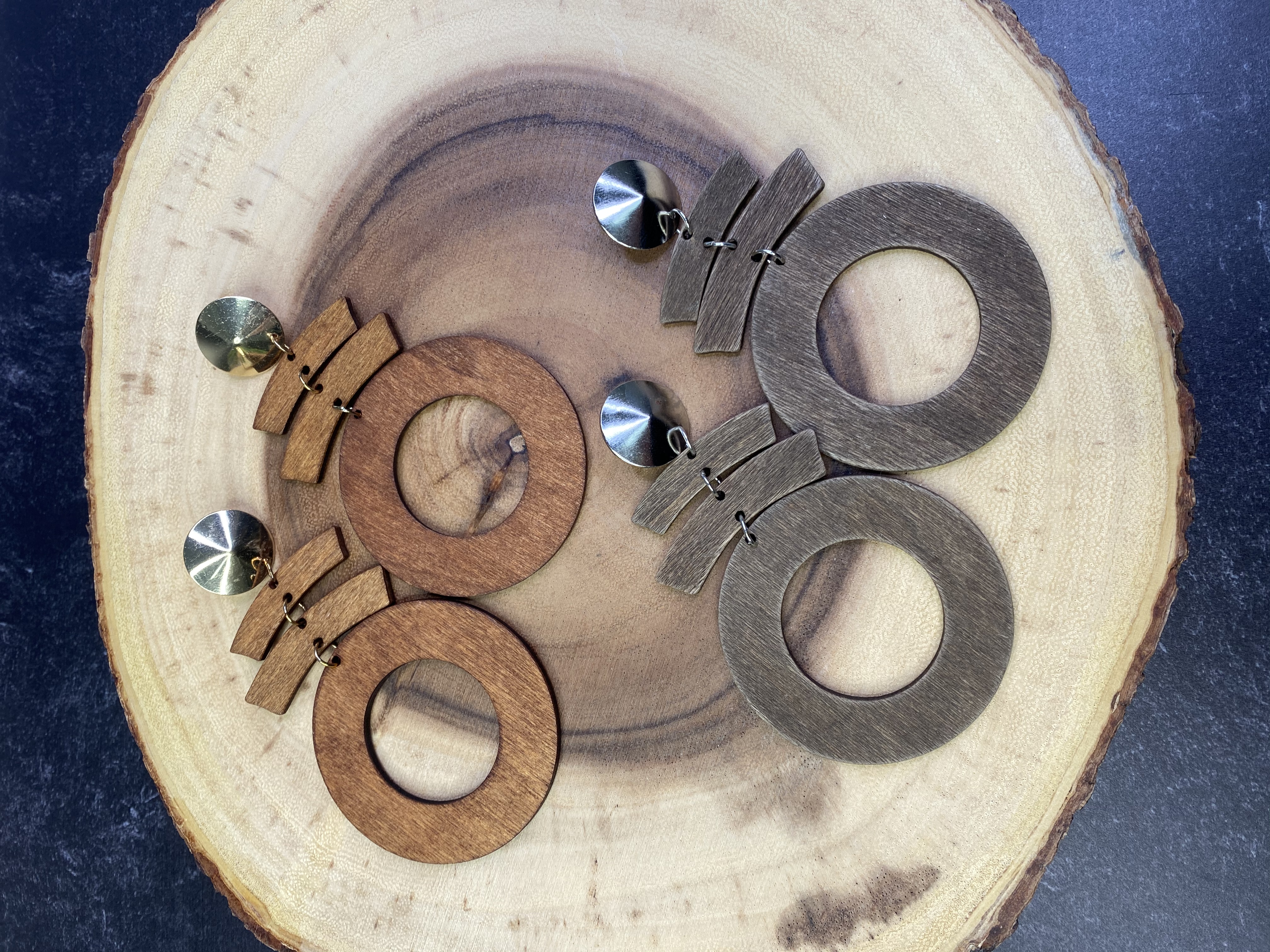 Measuring three inches these statement earring are light as a feather with tons of style!! Wood and metal, in either gold or silver make this mixed media piece perfectly on trend!